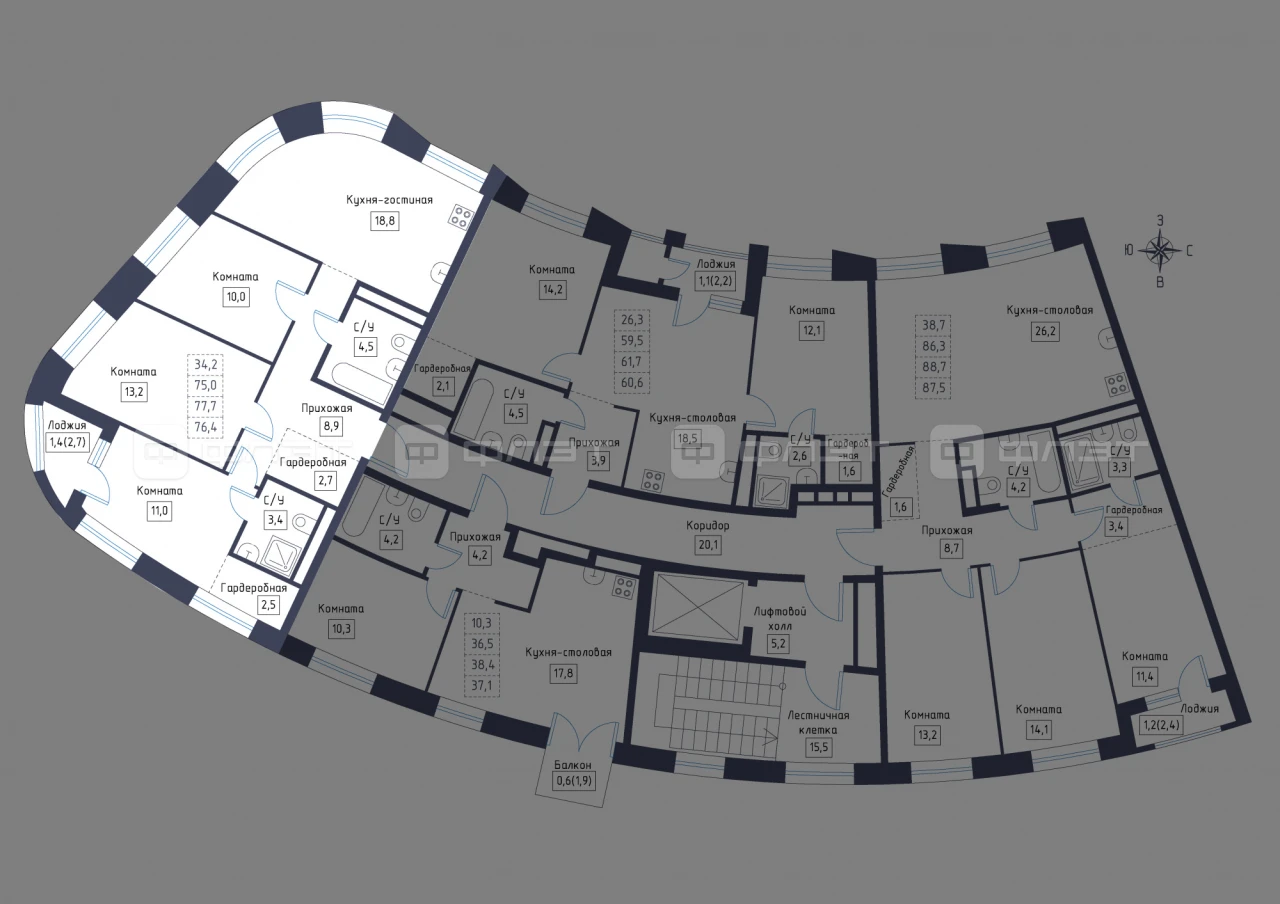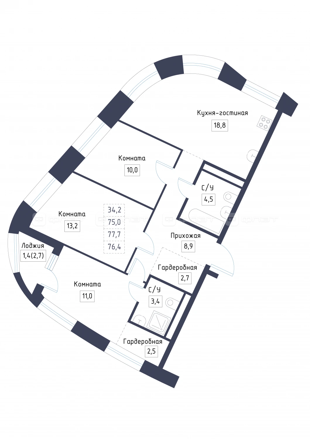 - 76.4/34.2/18.8 м²